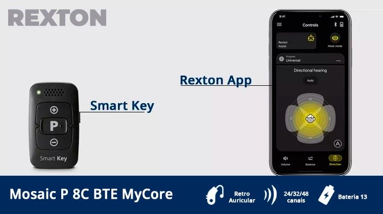 O Aparelho Auditivo Mosaic BTE é um aparelho altamente discreto que oferece um grande controle e fácil manuseio por meio do Rexton App e Smart Key Remote.